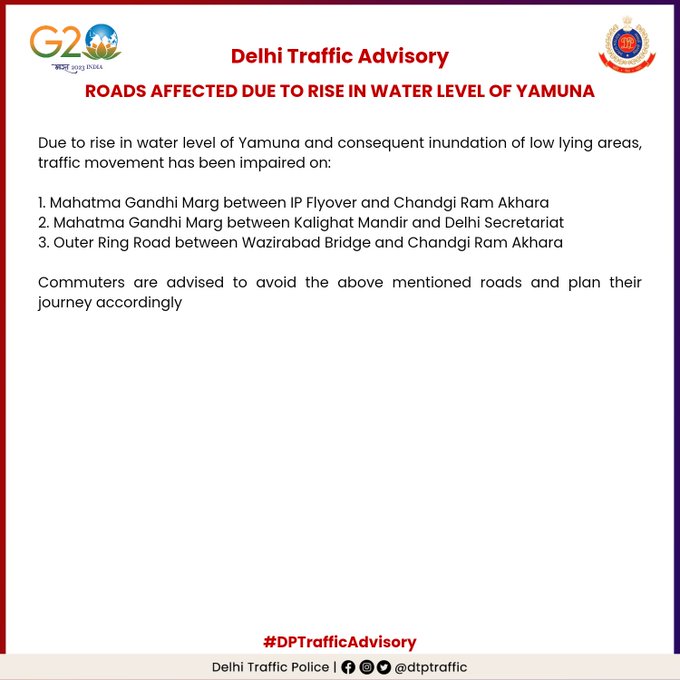 हरियाणा के हथिनीकुंड बैराज से यमुना नदी में पानी छोड़ना जारी है। फिलहाल जलस्तर खतरे के निशान से तीन मीटर से अधिक ऊपर है। दिल्ली ट्रैफिक पुलिस ने गुरुवार सुबह अपनी एडवाइजरी में कहा कि निचले इलाकों में पानी भर जाने के कारण कुछ सड़कों पर यातायात प्रभावित हुआ है। कृपया किसी भी असुविधा से बचने के लिए सलाह का पालन करें।