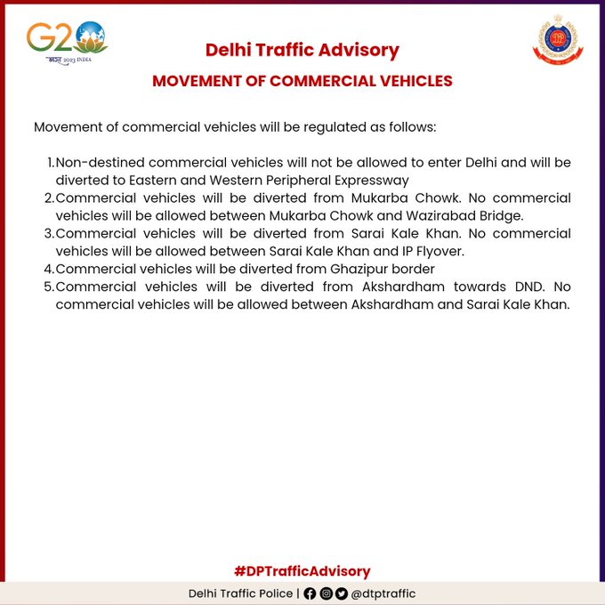 अपनी दूसरी एडवाइजरी में ट्रैफिक पुलिस ने कहा कि कॉमर्शियल गाड़ियों की आवाजाही को रेगुलेट किया जाएगा। लोगों को किसी भी असुविधा से बचने के लिए सलाह का पालन करना चाहिए।