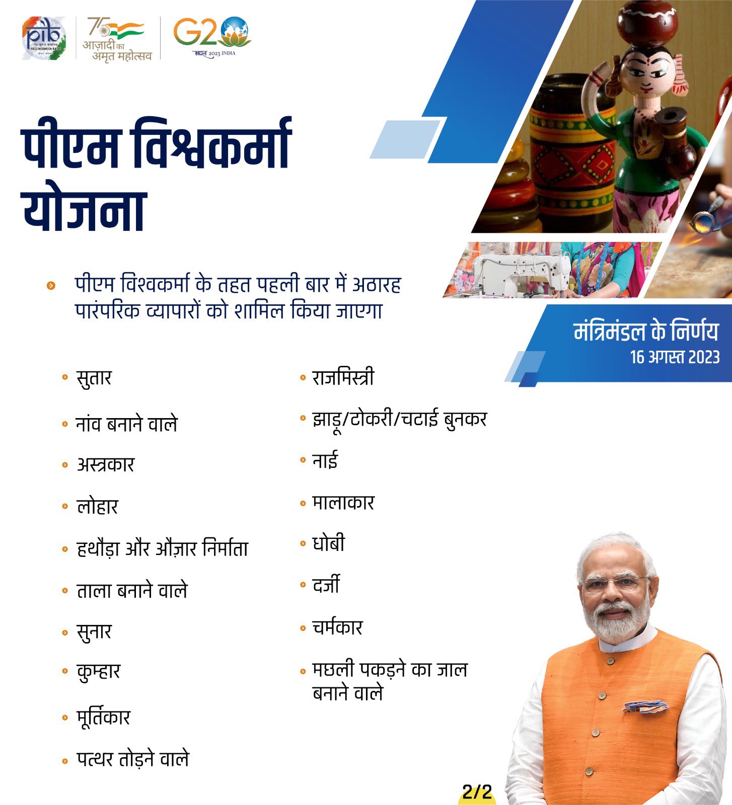 - श्रमिकों, कारीगरों और शिल्पकारों के लिए सरकार विश्वकर्मा योजना लेकर आई है.