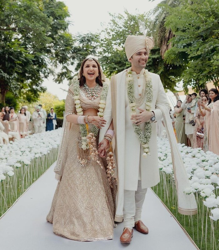 परिणीति और राघव की शादी के फोटोज सोशल मीडिया पर चर्चा का विषय बन गए हैं. दोनों ने एक दूसरे को कॉम्पलीमेंट करते हुए अपने वेडिंग आउट फिट कैरी किया. दोनों का लुक सिम्पल पर क्लासी था. राघव का हाथ थामे परी ने वेडिंग वैन्यू पर एंट्री की और उनकी बड़ी सी मुस्कान उनके दिल की बात साफ बता रह थी.