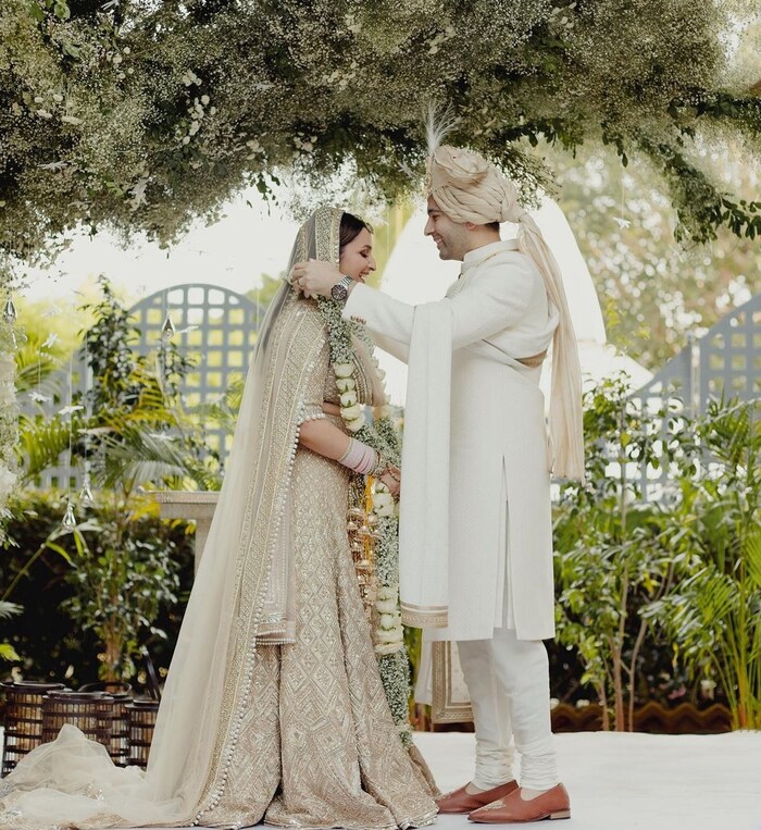 परिणीति ने वरमाला की एक फोटो साझा की, जिसमें यह सेलेब्रिटी कपल बेहद खूबसूरत नजर आ रहा है. परिणीति नजरें झुकाए शरमाती हुई नजर आ रही हैं और राघव के चेहरे पर भी मनमोहक मुस्कान दिख रही है.